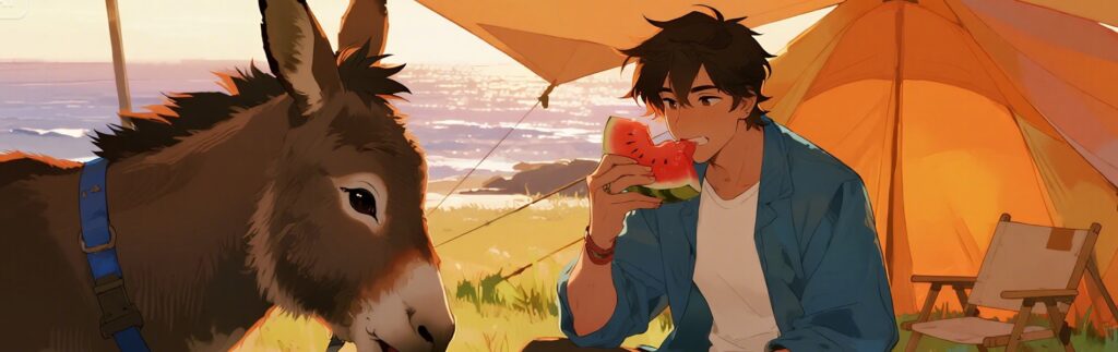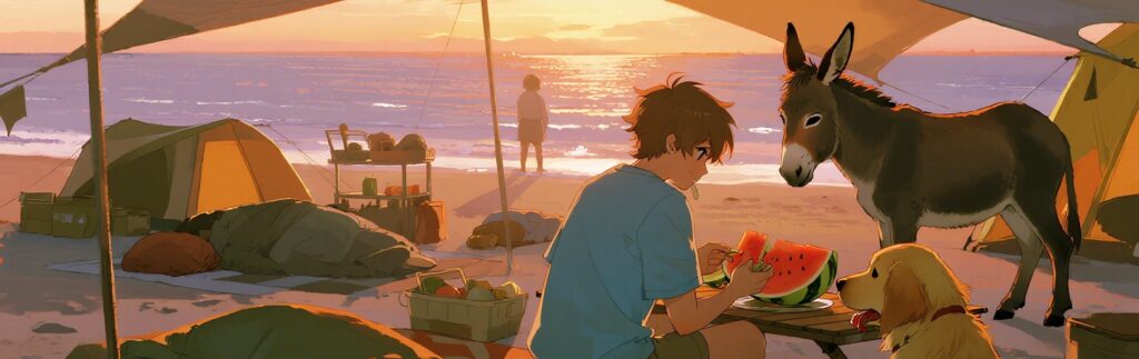 スライダーブロック 2025年7月31日 最終更新日時 : 2025年8月2日 pochi キャンプ場でテーブルに座ってスイカを食べている青年? ダメだよ、ひとりで食べちゃ~? 海沿いのキャンプ場でテーブルに座ってスイカを食べている あえて見ないようにしているゴル つぶらな瞳のロバくん 髭面を何とかして欲しいけどそんな事ロバとゴルには関係ないはやくスイカ頂戴! スライド画像サイズ4枚を1900px ☓ 600px で作成 文字を表示させると画像からカバーに変化し、横長の画像がすこしだけ縦横比が変化する