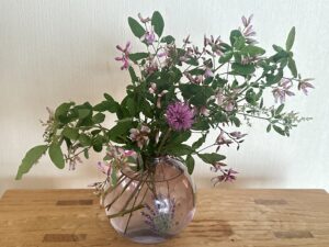 朝歩きをしていると道端の花々が無性に愛おしくなります もぎ取って持ち帰り小さな花瓶飾ると一段と可愛らしい 百均でハサミを買い求め袋を作りました 痛めることなく 野の花ドロボーです 萩・あざみ・綿の実 道端で道草を喰う?